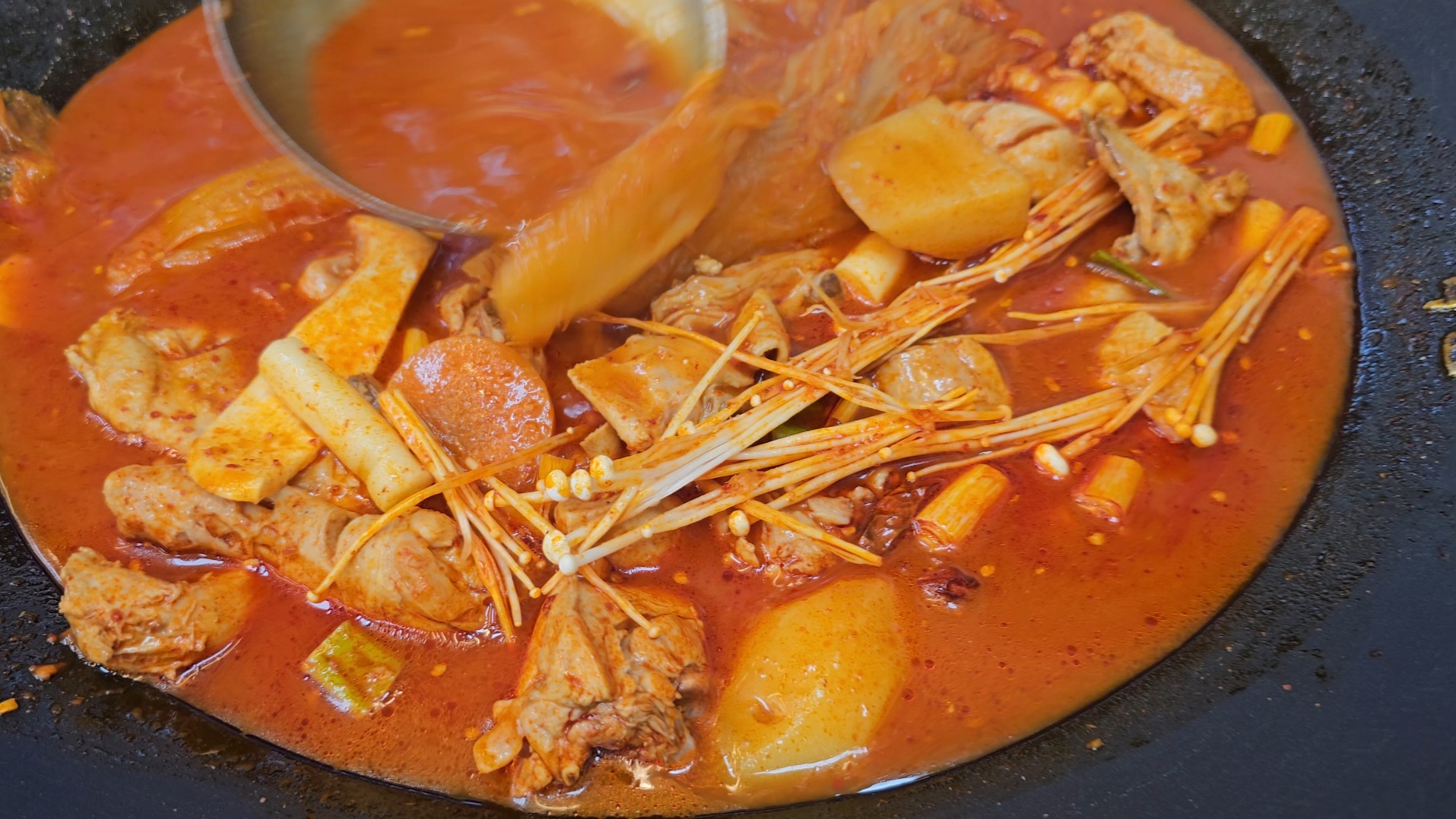 거대한 솥뚜껑과 함께 등장한 닭도리탕은 아주 먹음직 해 보였습니다