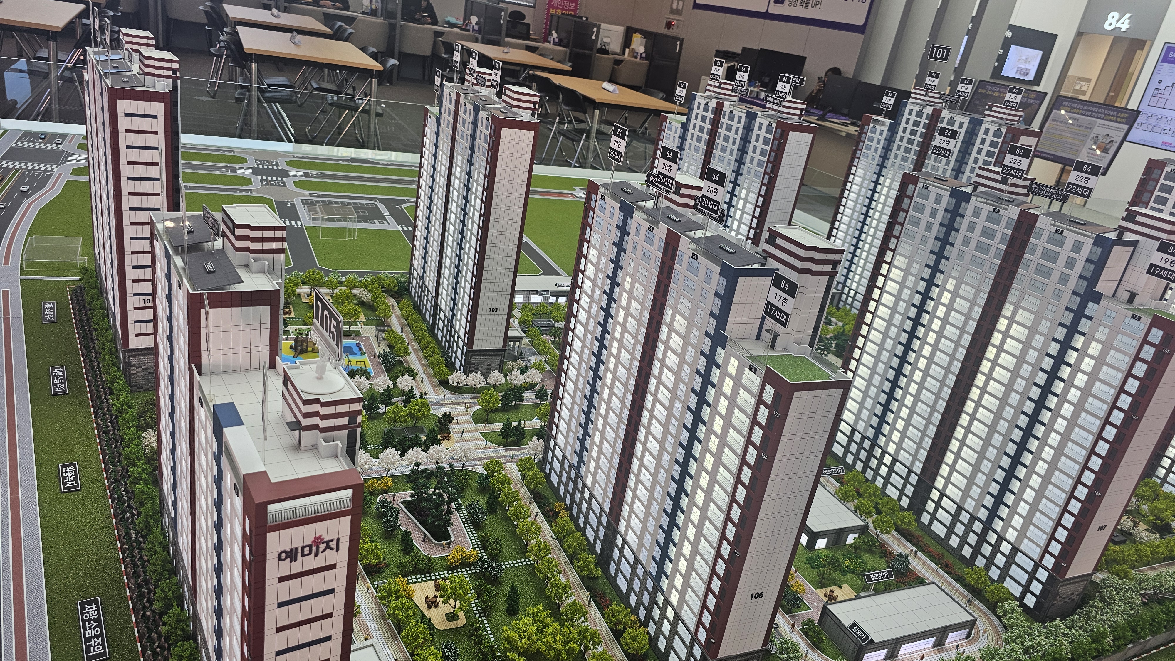 모델하우스에서 단지 모양을 보시면 동간거리가 확실히 넓은 걸 확인할 수 있습니다